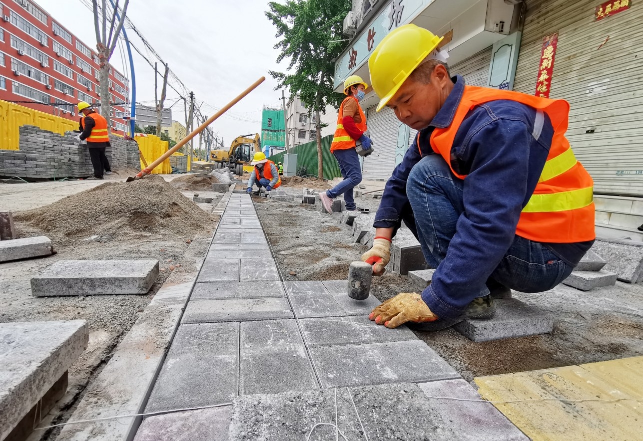 4月28日,市區毓秀路綜合整治提升改造工程現場,工人正在進行地磚鋪設。該工程全長1380米,北起蓮城大道、南至許扶運河橋,將開展行車道改造、慢車道改造、人行道改造、熱力管網鋪設、給排水井蓋更換等項目建設,完工后將極大改善毓秀路形象,提升沿線群眾幸福感和滿意度。 本報記者 喬利峰 攝