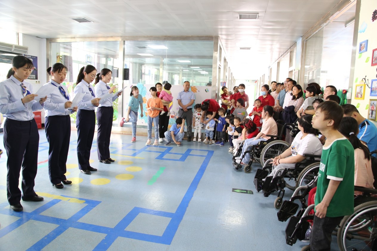 5月27日,市政府辦公室、市社會福利院開展了黨支部共建暨“關愛殘障兒童,共同呵護成長”活動,為孩子們捐贈了圖書、日化用品等物資。圖為12345政務服務熱線話務員和孩子們進行互動表演,現場氣氛活躍。 崔雨夢 攝