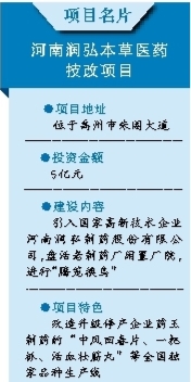 該項目是禹州市中醫藥企業戰略重組和技術改造項目,由河南潤弘制藥股份有限公司投資建設。據悉,該項目總投資5億元,通過引入國家高新技術企業河南潤弘制藥股份有限公司,盤活老制藥廠閑置廠院,進行“騰籠換鳥”,改造升級停產企業藥王制藥的“中風回春片、一把抓、活血壯筋丸”等全國獨家品種生產線。