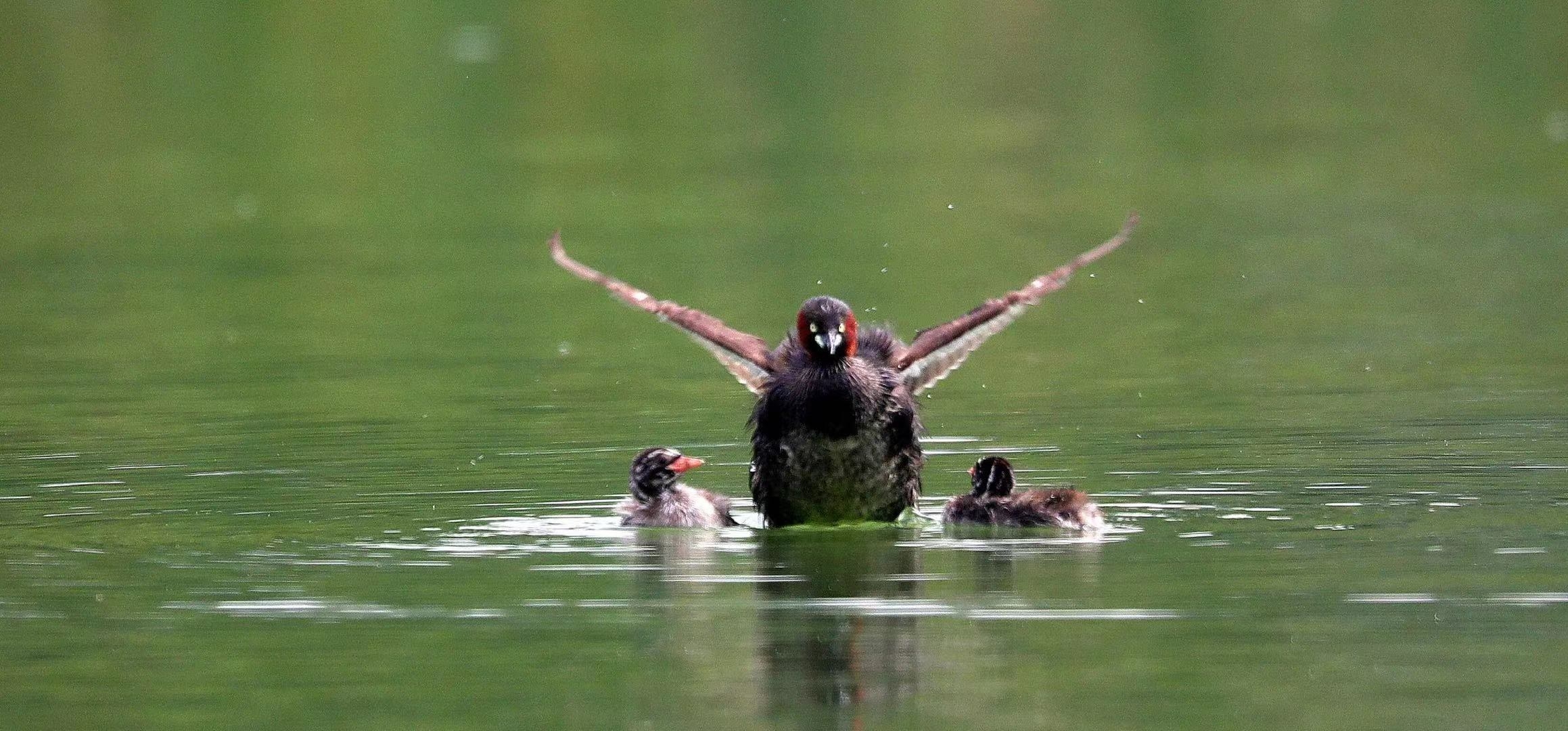 在市區(qū)芙蓉湖,一只貔鵜帶著兩只小貔鵜在湖中嬉戲。突然,貔鵜看見(jiàn)前方水面上蕩起層層波紋,不自覺(jué)地張開(kāi)翅膀保護(hù)小貔鵜。 晨報(bào)攝友 高文勝 攝