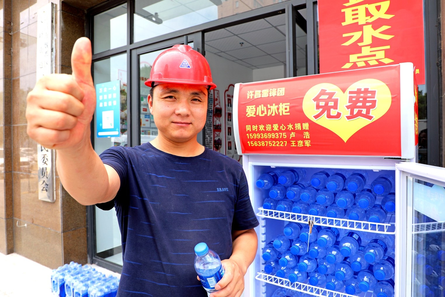 6月20日,許昌雷鋒愛心社團在建安區許由街道辦事處魏風社區舉行“愛心冰柜”啟動儀式。當日,許昌雷鋒愛心社團在市區19個門店門口設立“愛心冰柜”,為環衛工人、快遞員、建筑工人等戶外工作者免費提供礦泉水。許多愛心商家主動補充礦泉水,供戶外工作者取用,分享清涼與關愛。圖為一名建筑工人取用“愛心冰柜”內的礦泉水后為公益活動點贊。 本報記者 譚宜姝 攝