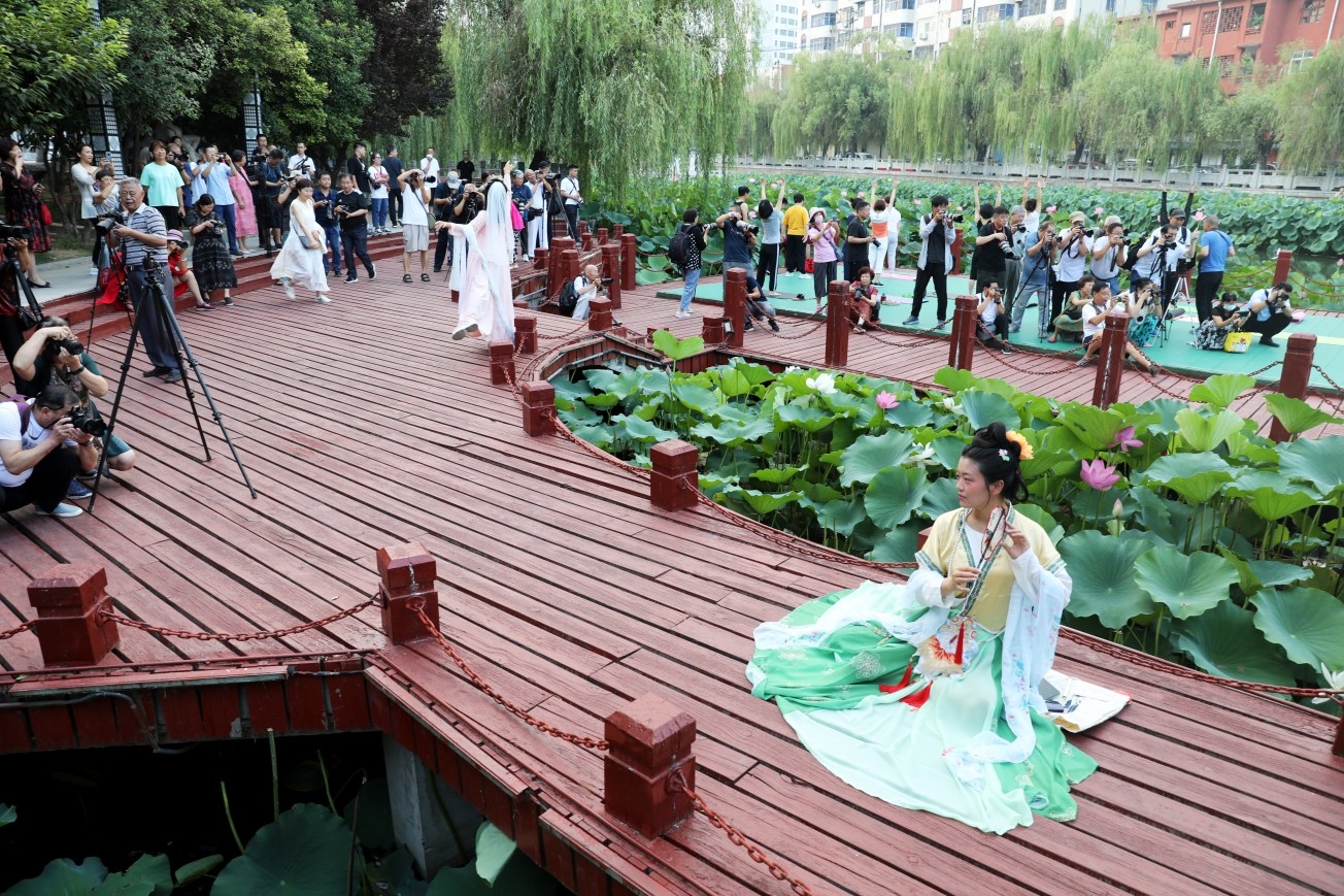 7月12日,市區護城河畔,攝影愛好者在拍攝荷花美景。隨著盛夏來臨,我市水系河道內種植的荷花陸續盛開,吸引市民賞花拍照。 本報記者 喬利峰 攝