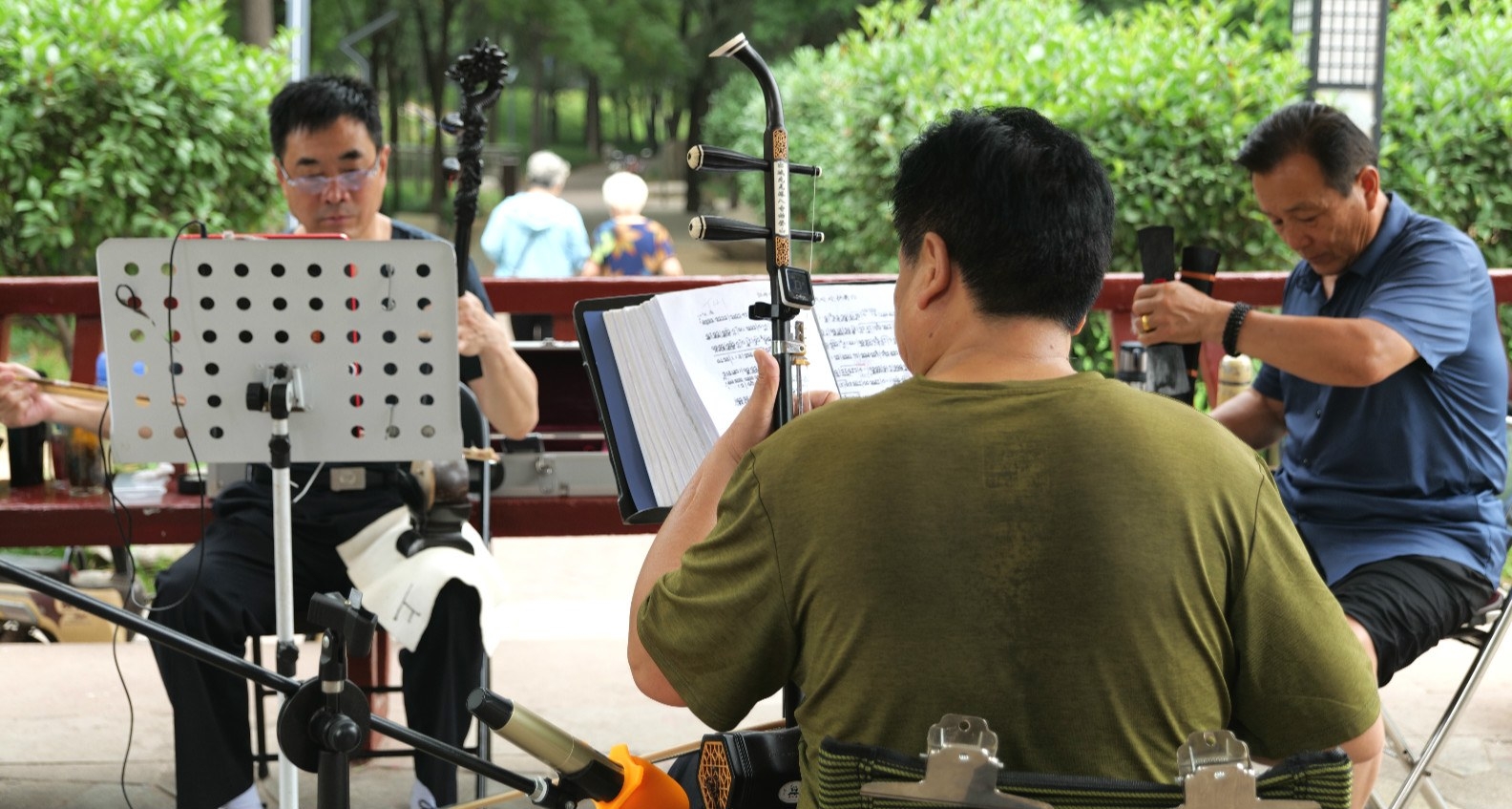 沒有過多的寒暄,喬峰拿出二胡,取出折疊板凳,在亭子里找了個空隙坐定。
