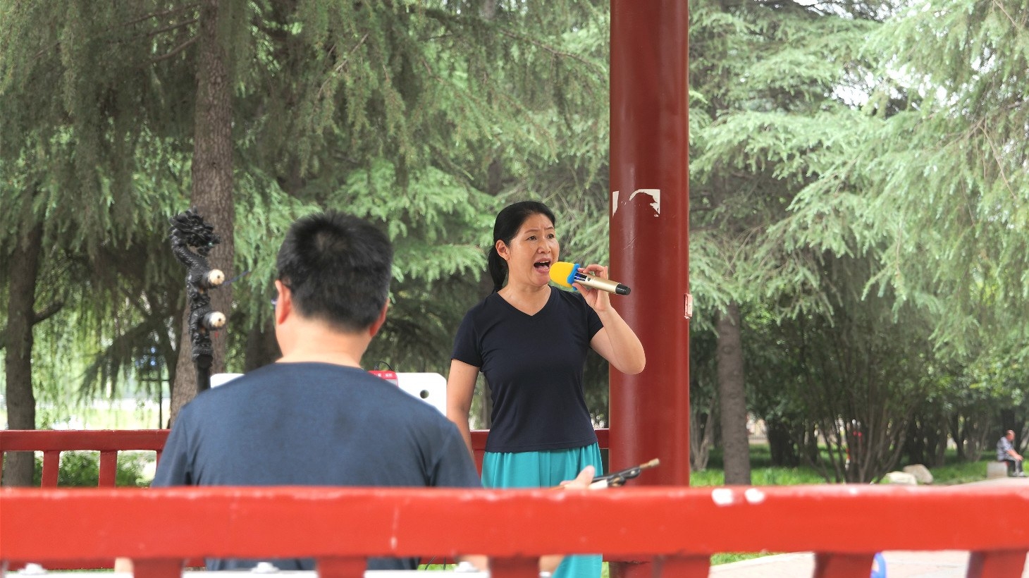 7月7日7時40分許,夏季的陽光還沒開始展現它的威力。此時,街頭熙熙攘攘——生活讓人忙碌,也讓人充滿朝氣。從東往西行至接近八一路與萬豐路交叉口,八一路以北的清潩河段休閑廣場上傳來婉轉的戲調。我背著相機包,踏進廣場,循聲往北前行。吹拉彈唱的聲音漸漸清晰,我看到前面的亭子里有一名身姿婀娜的女子在唱戲。走近亭子,發現這里還有兩位戲曲愛好者:一位在拉板胡,一位在敲司鼓。在他們的演奏下,女子的演繹生動與鮮活起來。