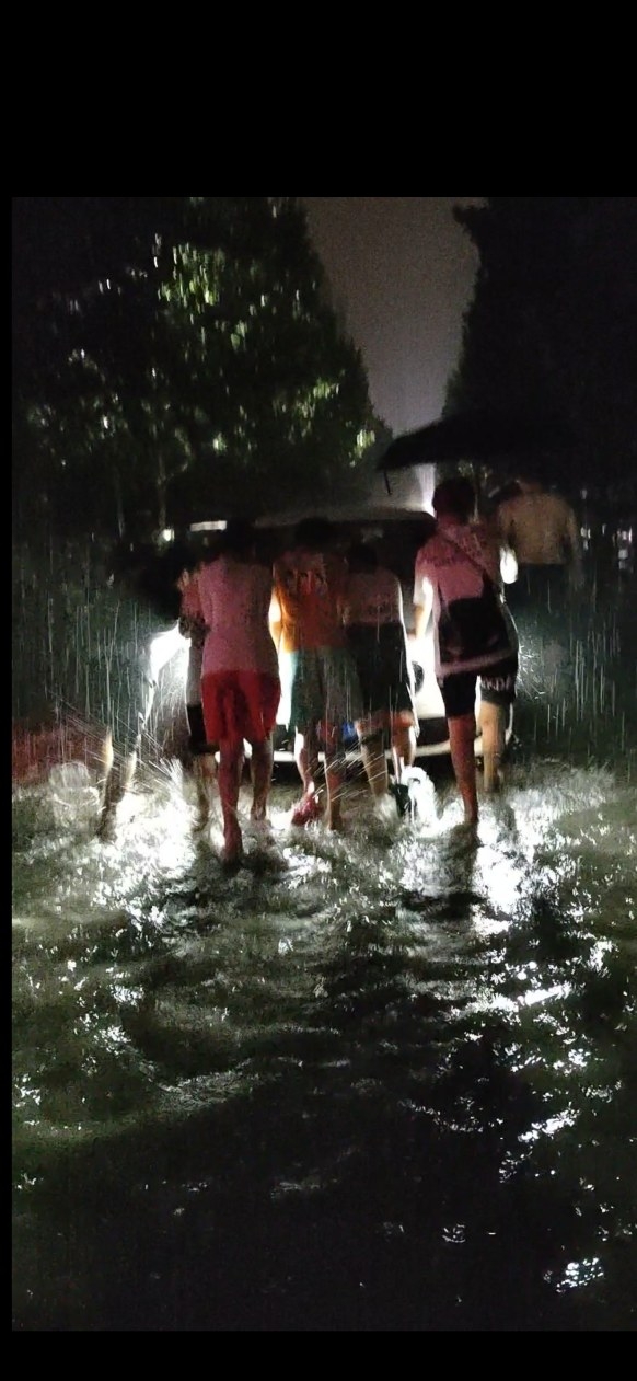 汽車的燈光將如墨一般濃重的夜色“撕”開一道口子,密集的雨點(diǎn)落在渾濁的積水中,蕩起一圈圈漣漪。一群少年蹚著積水一邊前行,一名少年一邊沖汽車司機(jī)揮舞著雙臂,大聲呼喊道:“叔叔,不要過!前面都淹了……”