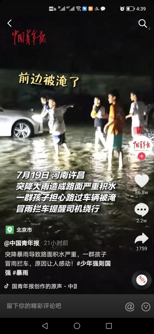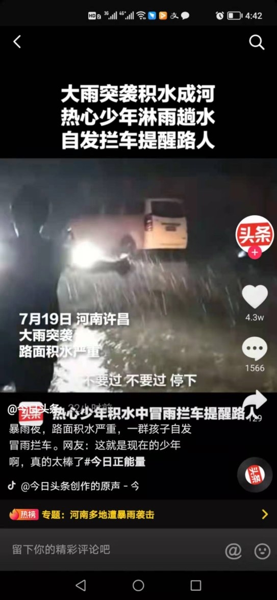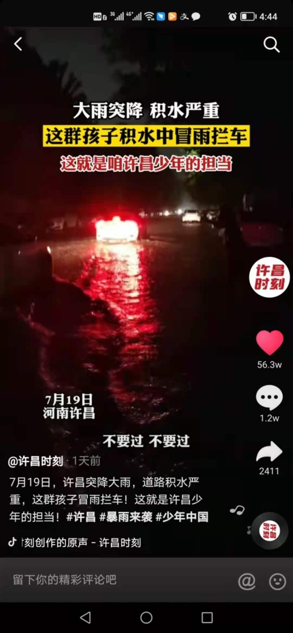 五名少年雨中攔車的一幕無意中“闖”進(jìn)了記者的鏡頭。7月19日深夜,許昌報(bào)業(yè)傳媒集團(tuán)旗下的抖音號許昌時(shí)刻以《大雨突降積水嚴(yán)重,這群孩子積水中冒雨攔車,這就是咱許昌少年的擔(dān)當(dāng)》為題,推送了一條短視頻。一天之內(nèi)播放量接近1000萬次,點(diǎn)贊量達(dá)到了56.3萬,網(wǎng)友留言1.2萬條。