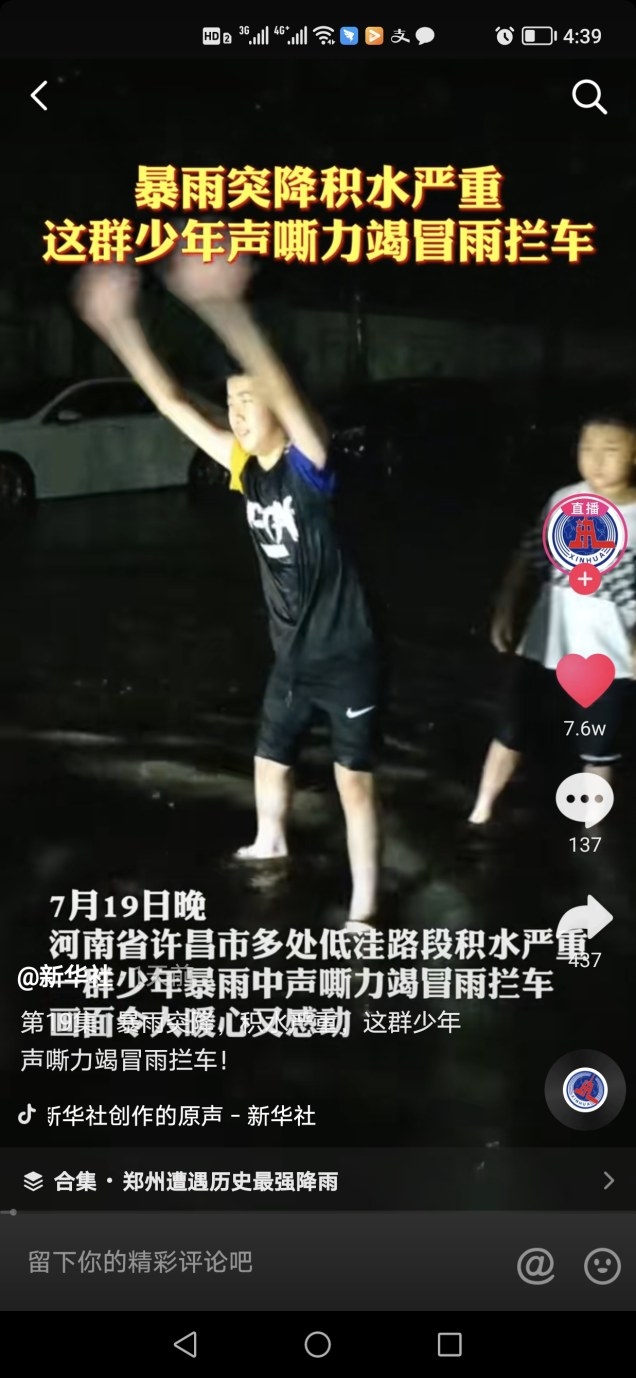 此次河南普降暴雨,受暴雨影響,河南多地出現(xiàn)內(nèi)澇、洪水,街邊車輛被卷走,災(zāi)情牽動(dòng)著全國人民的視線。“暴雨中的河南力量”在抖音平臺連續(xù)多日登上“熱榜”。五名少年在積水中冒雨攔車,這條視頻作為“暴雨中的河南力量”系列視頻之一,同樣持續(xù)多日處于“熱榜”之上。