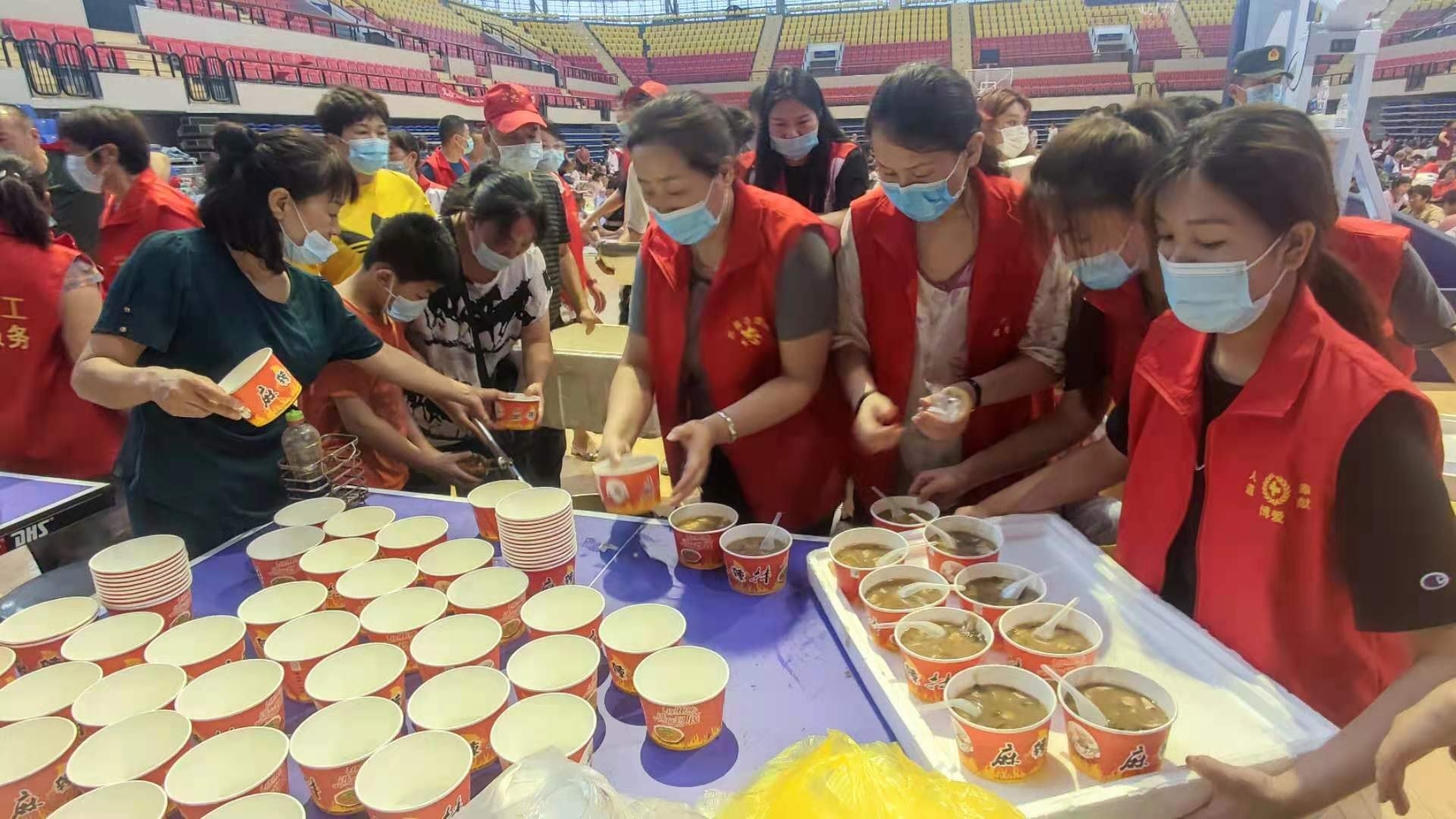 7月22日晚,長葛市體育場受災群眾安置點,愛心人士為受災群眾送來油饃和胡辣湯。 孫江鋒 攝