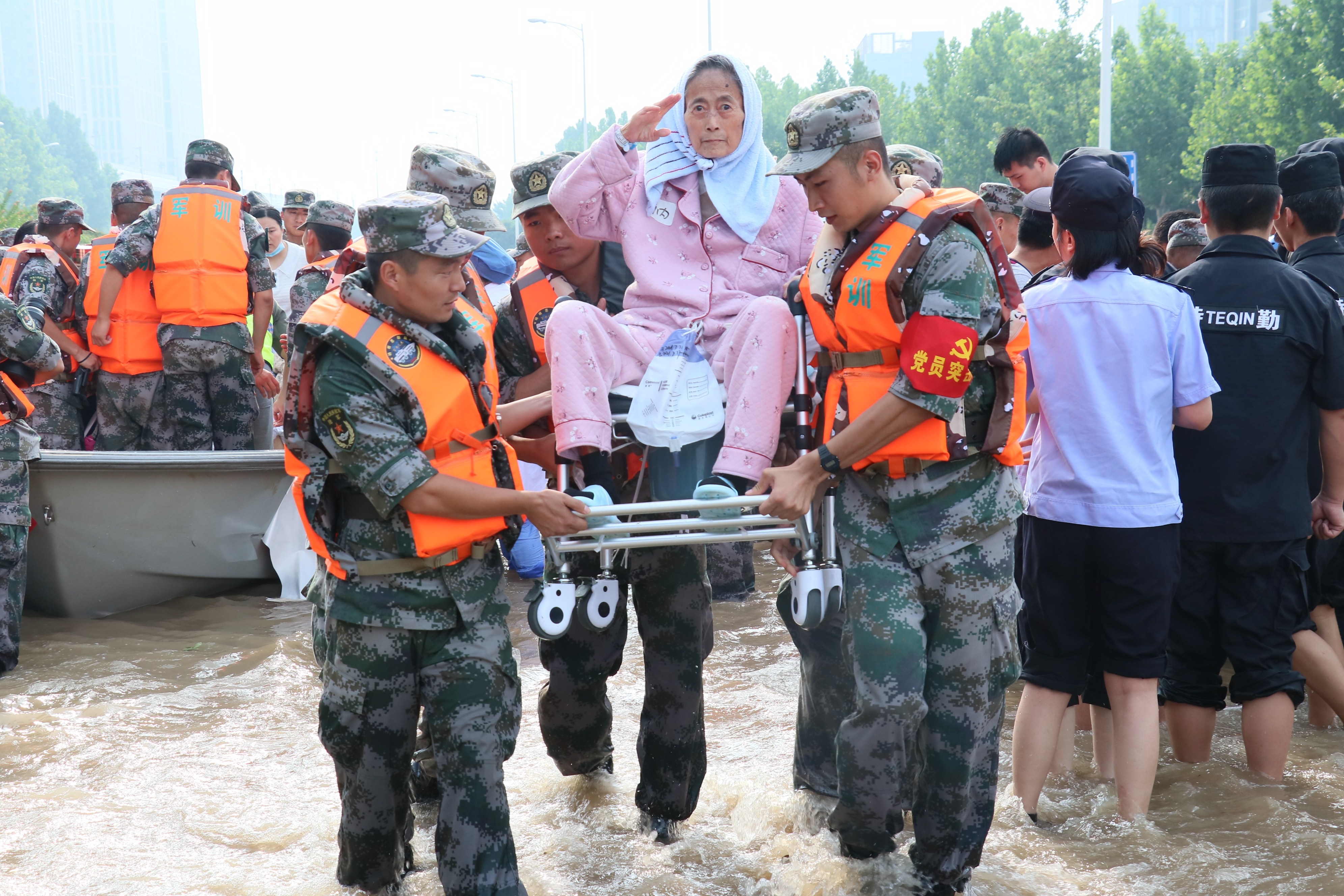 連日暴雨,洪水倒灌鄭州阜外華中醫院,致使5000人受困,楊根思部隊官兵火速馳援。圖為7月22日,官兵協力護送重癥老人抵達安全區域。 季鵬 鄭夏云 攝