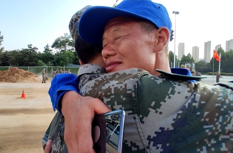 7月24日下午,在鄭州防汛救災一線,參與搶險的楊根思部隊列兵楊帆和身為京山飛鷹救援隊隊員的父親楊海燕相逢,父子倆緊緊相擁。 季鵬 鄭夏云 攝