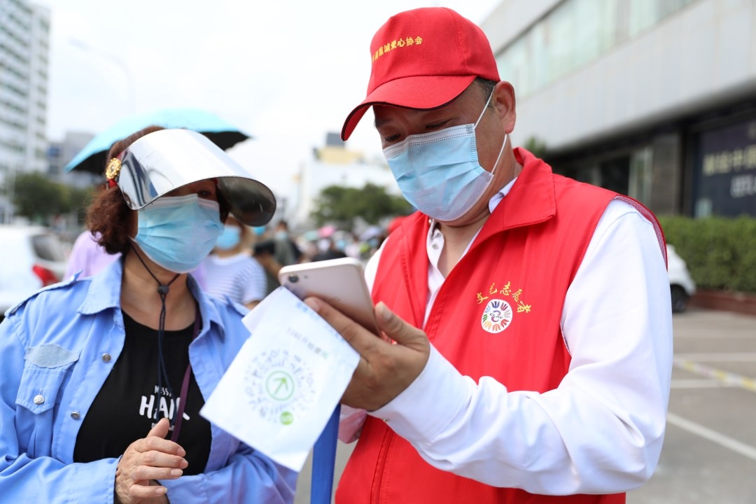 8月6日,志愿者在核酸檢測點幫助市民進行數據輸入。