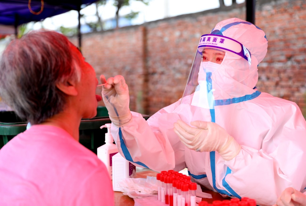 8月7日,醫務人員為社區居民進行核酸檢測采樣。