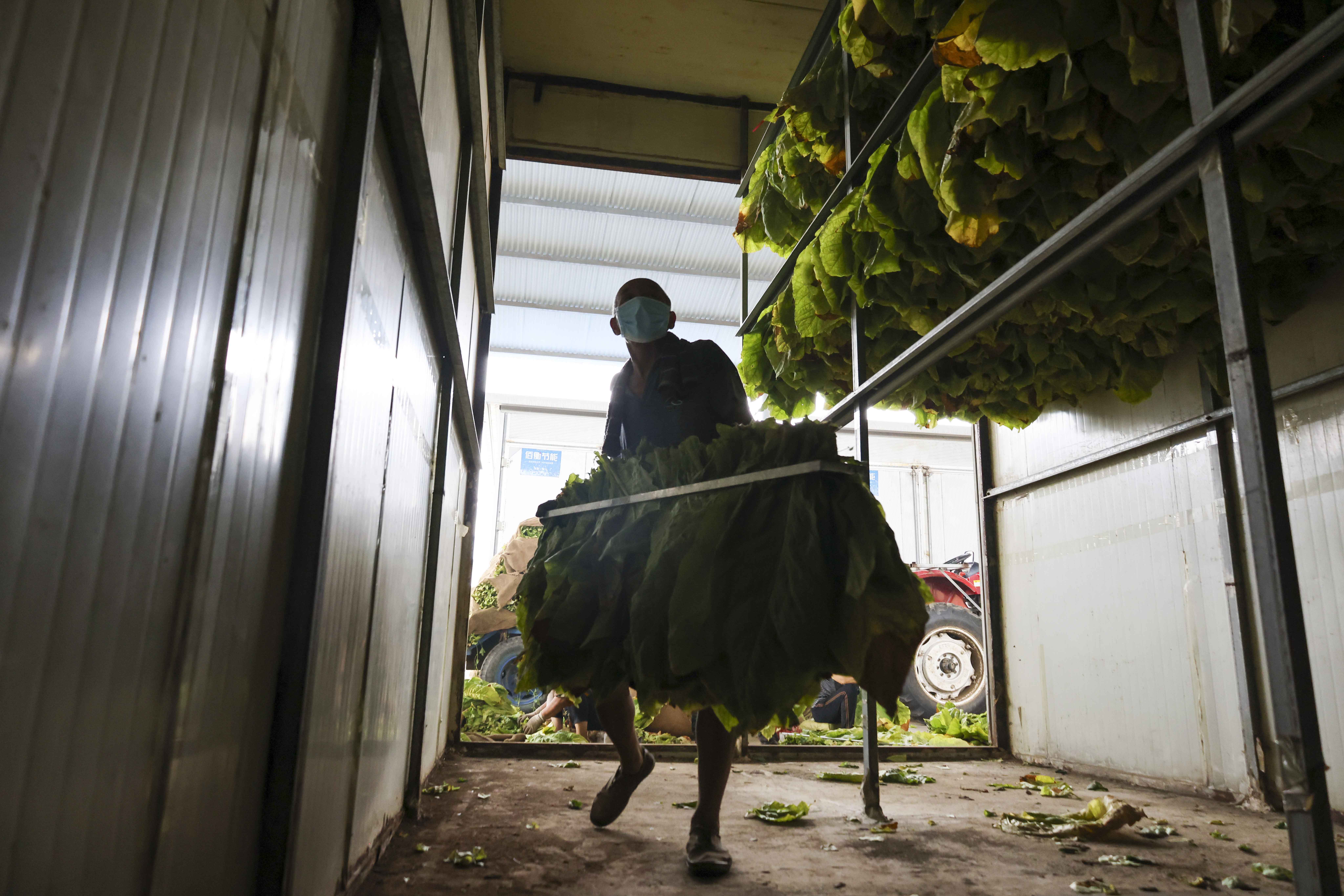 2021年8月16日,河南省許昌市襄城縣王洛鎮(zhèn)仲王村煙葉烘烤工場,煙農(nóng)正在將編桿后煙葉裝炕烘烤。姜昊楠攝