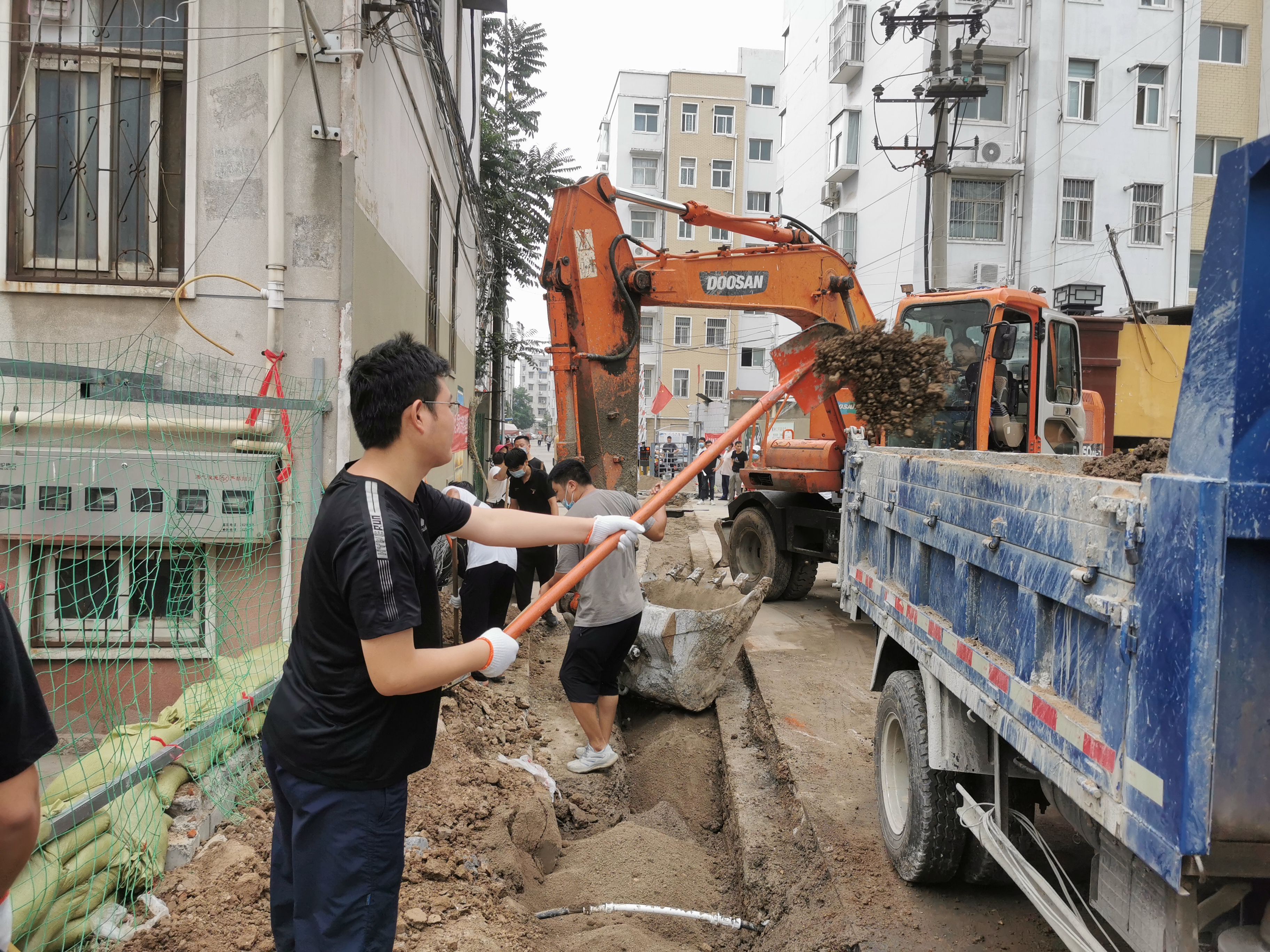 8月22日,市市政公司工作人員,抓緊時(shí)間施工提升改造排水設(shè)施,確保安書巷內(nèi)市安裝公司家屬院、書香苑小區(qū)等小區(qū)順利度過汛情!簽約攝影師 李保利 攝
