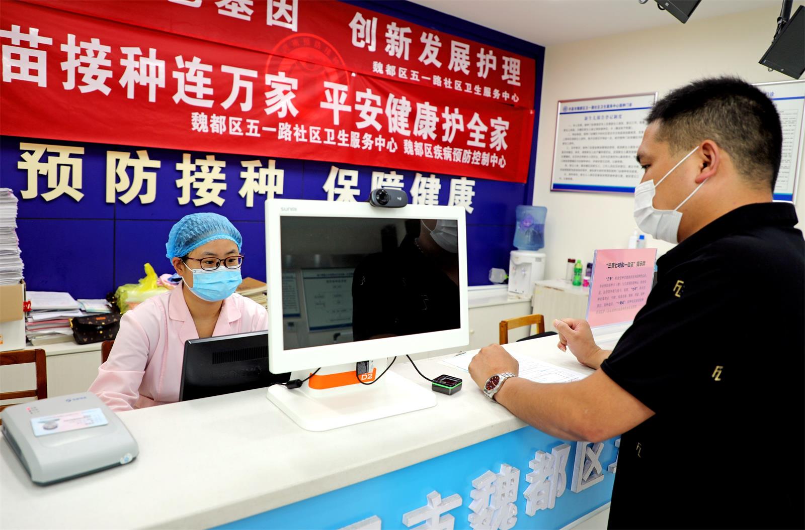 8月23日,許昌市魏都區(qū)五一路社區(qū)衛(wèi)生服務(wù)中心醫(yī)務(wù)工作人員正在給18歲以上成年人登記注射新冠病毒疫苗。據(jù)魏都區(qū)疾病預(yù)防控制中心免疫規(guī)劃科科長陳少華介紹,8月21日起,魏都區(qū)14個新冠病毒疫苗接種點周末無休并開啟夜間工作模式,加快18歲以上人群新冠病毒疫苗接種。 記者 譚宜姝 攝