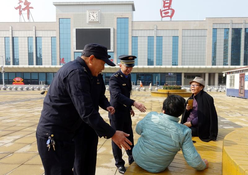 10月21日 ,許昌火車站廣場,市城市管理綜合執法支隊火車站治理辦公室工作隊員提醒群眾不要把座椅當成躺椅,注意自身形象。黃增瑞 攝