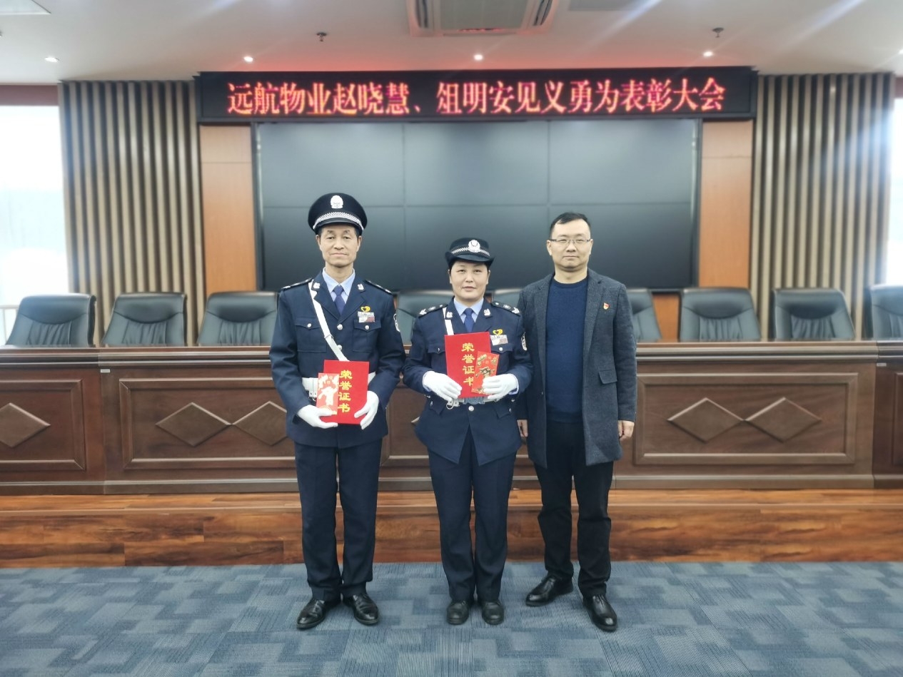 遠航物業黨支部表彰見義勇為員工趙曉慧(中)、俎明安(左)