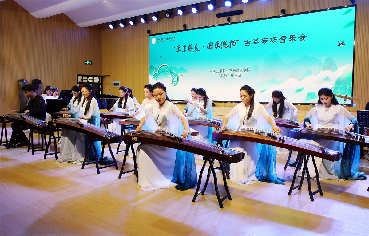 6月15日,我市在許昌職業技術學院舉辦“樂享盛夏·民樂悠揚”古箏專場音樂會,傳承和弘揚民樂文化。圖為樂手用古箏彈奏《夢回臨安》。本報記者 譚宜姝 攝