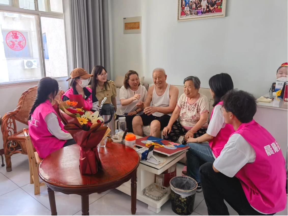 魏都區(qū)河西社區(qū)黨支部書記與許昌學(xué)院美術(shù)與設(shè)計學(xué)院“情系蓮城,助力成長”暑期社會實踐團(tuán)隊探望老黨員 金雪景攝