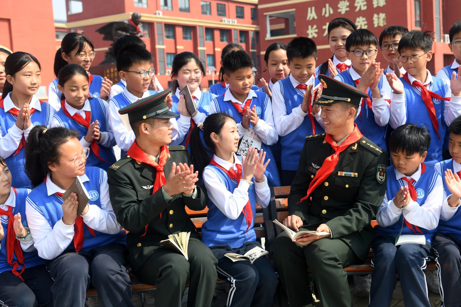 陸軍某合成旅“楊根思連”的張賽浦(前排右)、肖榮基和駐地“楊根思小學”的學生共同學習老連長楊根思的英雄事跡(2023年10月13日攝)。新華社發(季鵬 攝)