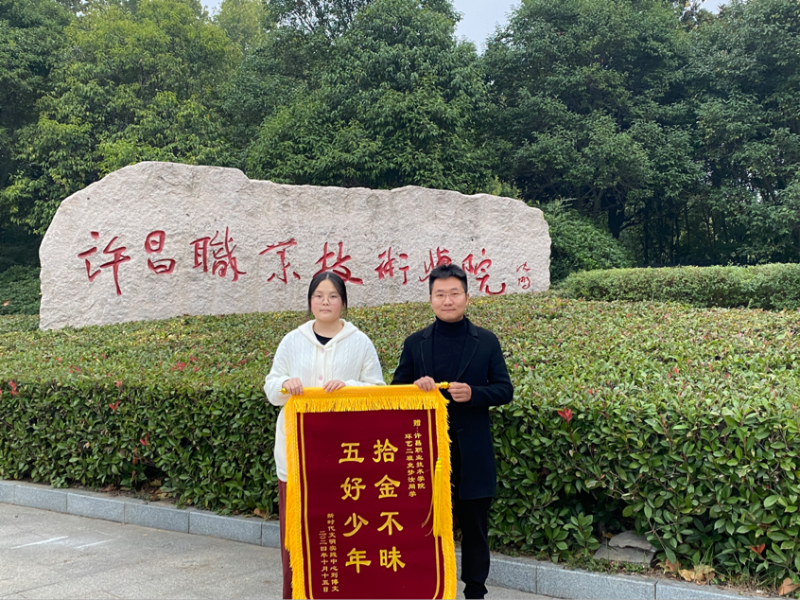 10月21日,許昌職業(yè)技術(shù)學院五年制部2024級環(huán)藝二班學生史夢汝收到一面印有“拾金不昧五好少年”的錦旗,這是市民劉先生她拾金不昧行為的真誠感謝。