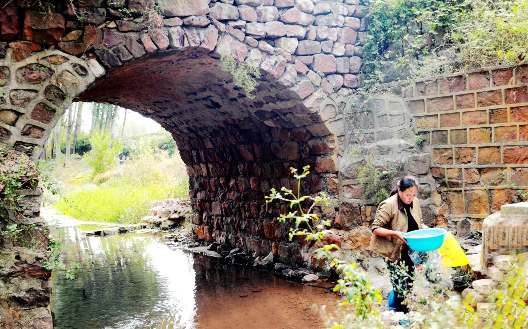 我們沿著水泥路向南下坡,西側民房墻壁上寫著“保護潁河源頭共建生態水源共享碧水藍天”的標語,東側則是用紅石堆砌而成的提灌渠,嘩嘩的流水聲也已響在耳邊。