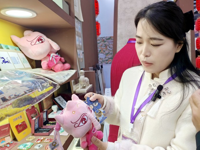 許昌博物館講解員汪潔琳向記者介紹“饕餮”系列文創產品。
