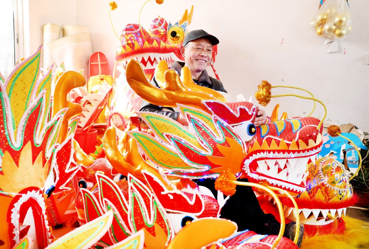 在村民霍浩然的家中,華美威嚴的龍頭和各式各樣的原材料擺滿院子,等待著發貨和組裝。