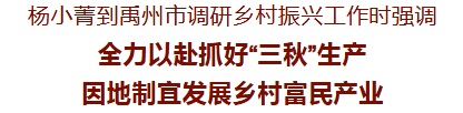 10月7日,市委書記楊小菁到禹州市調研鄉(xiāng)村振興工作,強調要深學細悟習近平總書記在河南考察時重要講話精神,認真落實省委、省政府部署要求,聚焦“農業(yè)增效益、農民增收入、農村增活力”,統(tǒng)籌抓好糧食生產、產業(yè)發(fā)展、鄉(xiāng)村治理等重點工作,在推進鄉(xiāng)村全面振興上不斷取得新進展、新成效。