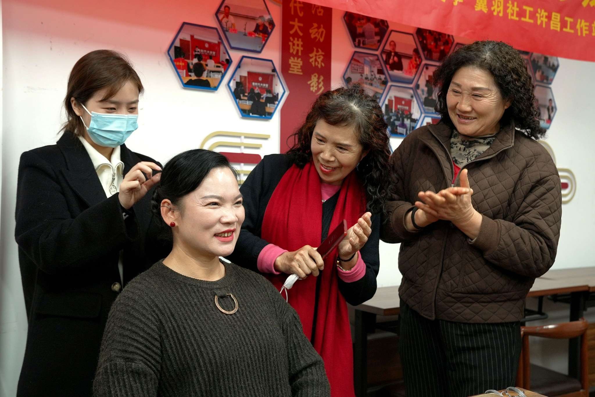 “阿姨,您平常自己涂粉底的時候,發際線部位別涂得太厚,否則妝容太假……”12月13日,魏都區文峰街道河西社區黨群服務中心二樓的大廳里,專業化妝師員靜左手拿著粉底膏,右手舉著粉擦,一邊給55歲的社區居民劉艷麗涂粉底,一邊講解化妝知識。