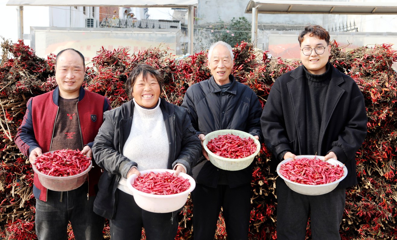 當(dāng)日,段墓社區(qū)黨群服務(wù)中心的廣場(chǎng)上整齊地?cái)[放著一垛垛紅辣椒,社區(qū)居民趁著天好,圍坐在一起摘辣椒。“嚓嚓嚓……”清脆的采摘聲此起彼伏,手指翻飛間,一個(gè)個(gè)紅彤彤的辣椒便被輕巧地收入囊中。