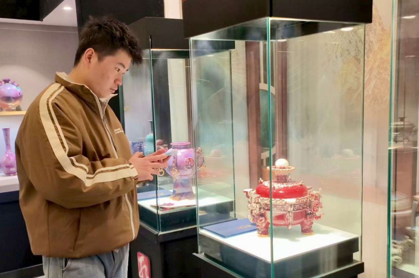 12月23日,許昌職業(yè)技術(shù)學(xué)院組織陶瓷設(shè)計與工藝專業(yè)在校生,走進(jìn)市區(qū)孔家鈞瓷展廳,開啟了一場沉浸式的非遺文化之旅。此次研學(xué)活動將課堂知識與社會實踐相結(jié)合,不僅讓學(xué)生深入領(lǐng)略了禹州鈞瓷窯變的神奇,也開闊了視野、增長了見識,更讓大家體會到中華優(yōu)秀傳統(tǒng)文化的獨(dú)特魅力與深厚底蘊(yùn)。本報記者 黃增瑞 攝