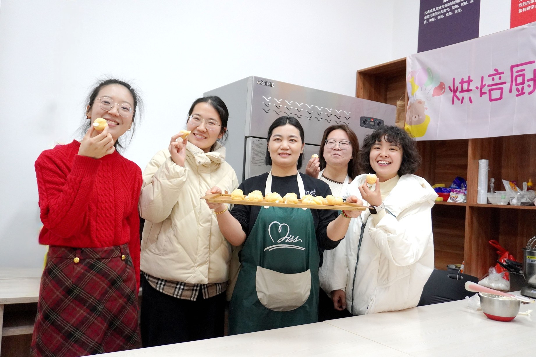 “先放200克淡奶油,再加20克白糖……”2025年12月29日晚,許昌科技廣場西側的許昌市青少年活動中心燈火通明。二樓青年夜校的烘焙教室內,烘焙老師張琳正耐心指導學員制作奶油泡芙。張琳邊操作邊講解,十幾個年輕人圍在操作臺前,有的目不轉睛地盯著她的動作,有的專心致志地用手機錄下制作過程。