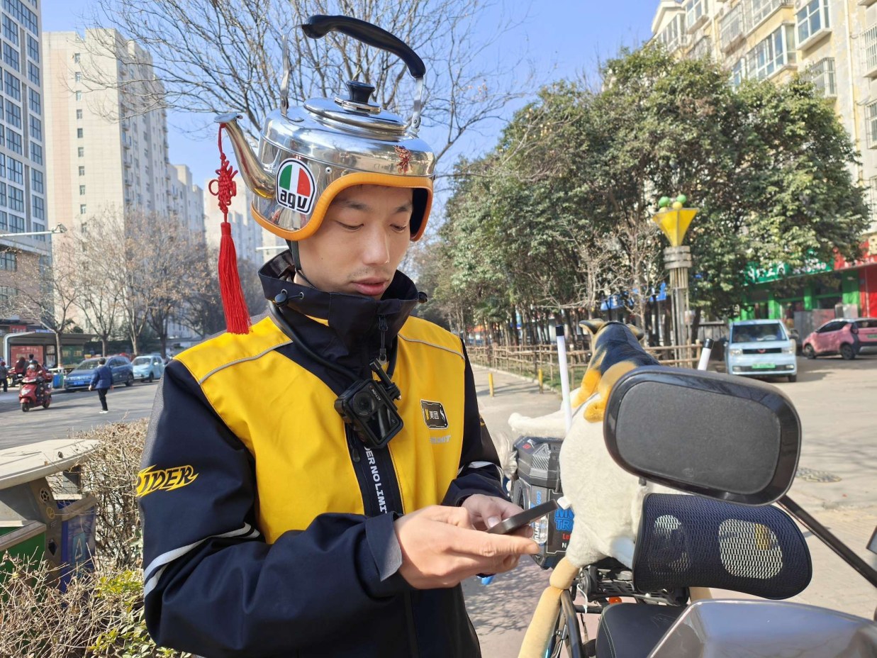 2月15日上午,春節(jié)前夕,在學(xué)府街東段一個(gè)外賣聚集點(diǎn),記者見到了正準(zhǔn)備接單的李錢深。他特意戴上那頂標(biāo)志性的“水壺”頭盔,穿上工裝,精神抖擻準(zhǔn)備出發(fā)。
