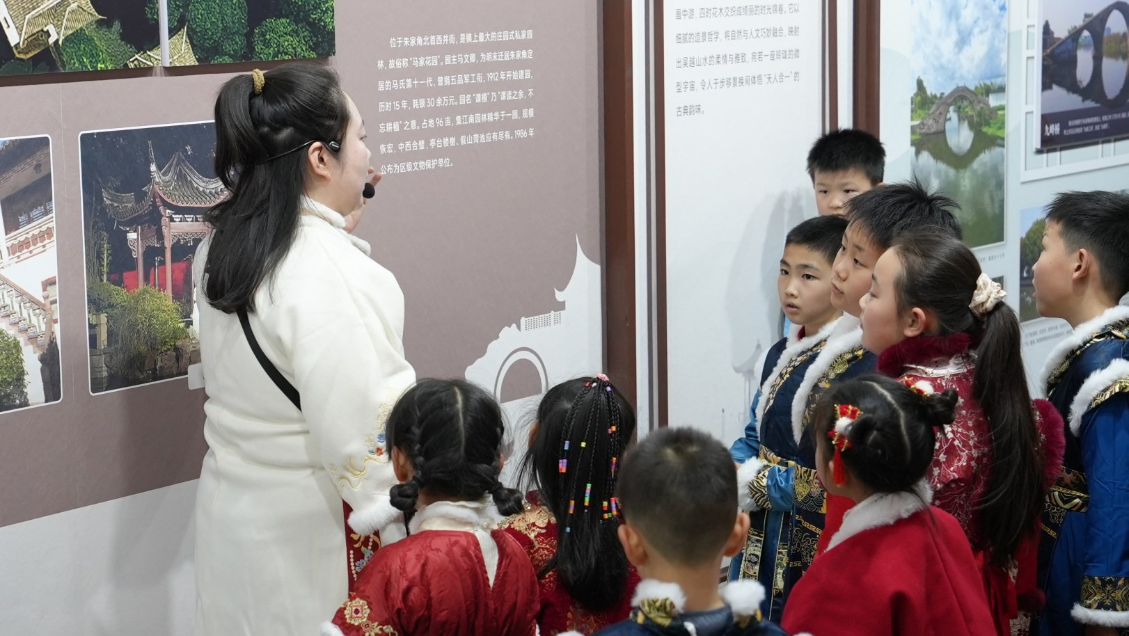 博物館講解員帶領孩子們參觀《望江南·水韻青溪》特展。