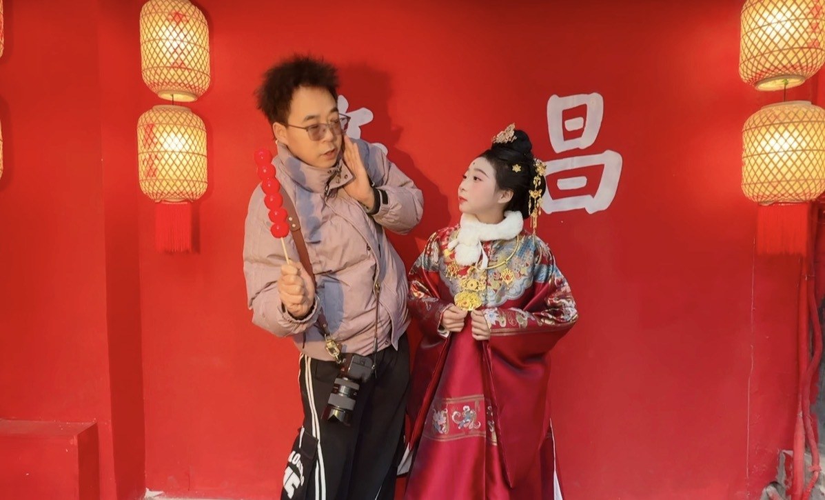 2月14日,曹魏古城張燈結彩,游人如織。“背挺直,回頭!”來自平頂山的旅拍攝影師侯帥帶著游客在南城門拍攝,城樓上紅艷艷的巨幅對聯映著華服,快門定格下跨越千年的浪漫。