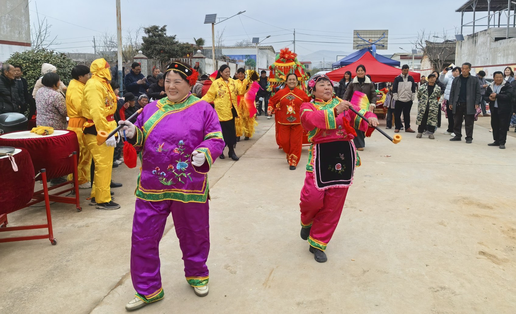 當(dāng)天是村里一年一度的傳統(tǒng)廟會。伴隨著鏗鏘的鑼鼓聲,舞龍隊伍從村口騰躍而來,金鱗在陽光下閃閃發(fā)光;秧歌隊的大娘們踩著鼓點扭得歡實,紅綢帶甩得噼啪響。孩子們舉著糖葫蘆在人群里鉆來鉆去,叫賣聲、談笑聲、鑼鼓聲混合在一起,把這個千年古村攪得熱氣騰騰。